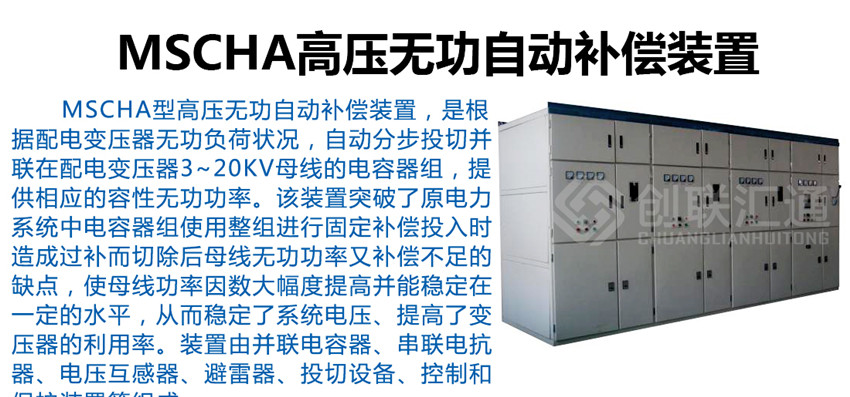 MSCHA型高壓無功自動補償裝置,是根據(jù)配電變壓器無功負(fù)荷狀況,自動分步投切并聯(lián)在配電變壓器3~20kV母線的電容器組,提供相應(yīng)的容性無功功率。該裝置突破了原電力系統(tǒng)中電容器組使用整組進(jìn)行固定補償投入時造成過補而切除后母線無功功率又補償不足的缺點,使母線功率因數(shù)大幅度提高并能穩(wěn)定在一定的水平,從而穩(wěn)定了系統(tǒng)電壓、提高了變壓器的利用率。裝置由并聯(lián)電容器、串聯(lián)電抗器、電壓互感器、避雷器、投切設(shè)備、控制和保護(hù)裝置等組成。