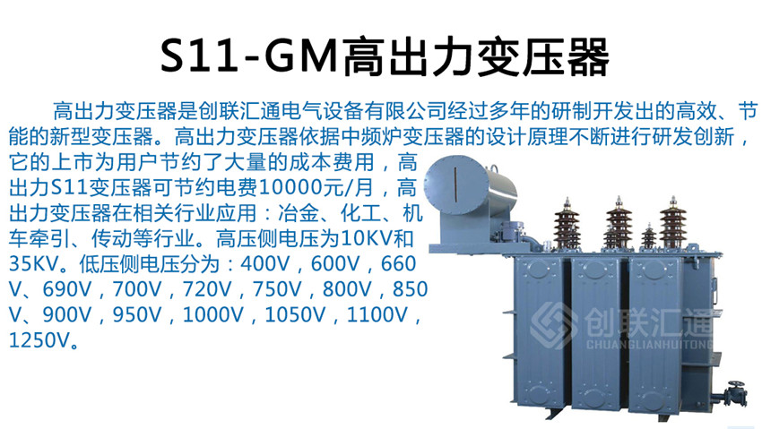 S11-GM高出力變壓器適用于冶煉廠、特別是鑄造廠、大型用電企業(yè)等,為用戶(hù)節(jié)省大量的固定電費(fèi),經(jīng)濟(jì)效益顯著。