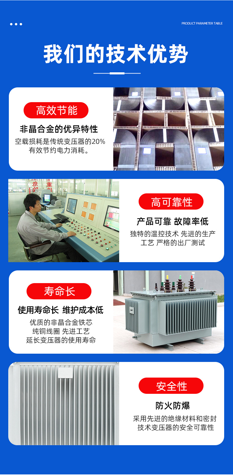 從環(huán)保角度來看,SH21非晶合金油浸式變壓器也是一個(gè)更可持續(xù)的選擇。由于其高效率和低能量損耗,SH21變壓器能夠減少對(duì)電力資源的需求,從而降低對(duì)環(huán)境的影響。此外,非晶合金材料在制造過程中使用的是可回收的材料,有助于減少?gòu)U物和減低碳足跡。