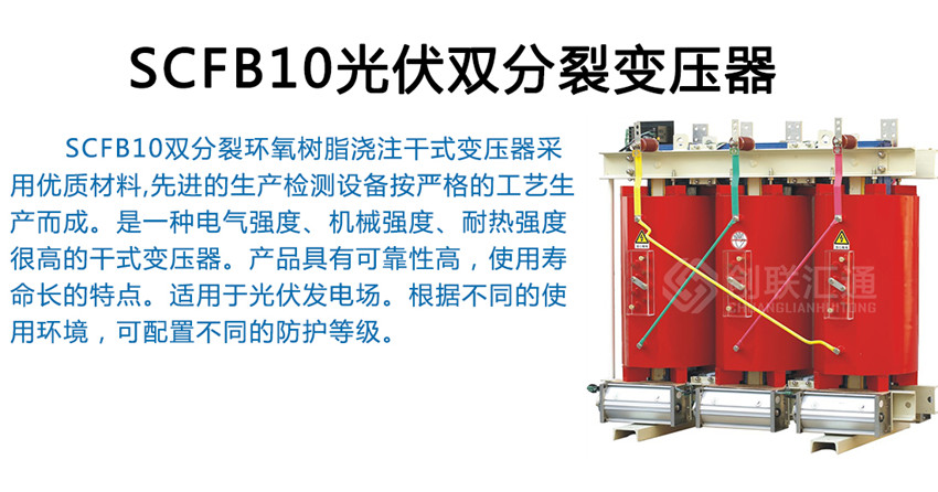 SCFB10雙分裂環(huán)氧樹脂澆注干式變壓器采用優(yōu)質(zhì)材料,先進的生產(chǎn)檢測設(shè)備按嚴格的工藝生產(chǎn)而成。是一種電氣強度、機械強度、耐熱強度很高的干式變壓器。產(chǎn)品具有可靠性高,使用壽命長的特點。適用于光伏發(fā)電場。根據(jù)不同的使用環(huán)境,可配置不同的防護等級。